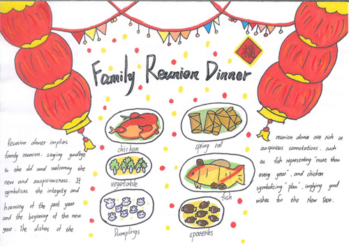 英语学科作品聚焦于学生英语表达能力与中西方文化融合的培养。同学们精心制作的英语手抄报,巧妙地将英语学习与春节文化、美食相结合。在绘制过程中,学生们不仅提升了英语运用能力,更增强了对民族文化的国际化表达,让传统文化以新颖的方式走向世界。