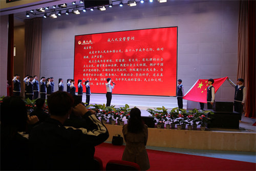 年轻的18岁公民们高举右拳,面对国旗庄严宣誓,响亮的声音,坚定的语言,表达了同学们十八岁成人的决心。
