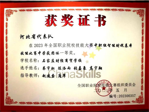 在2023年全国职业院校技能大赛(中职组)智能财税基本技能比赛中,我校代表队荣获团体一等奖,实现了历史性突破,赵建素、庞翠两位老师荣获优秀指导教师。在比赛中,4名参赛选手顽强拼搏、奋勇争先,展现了精湛的技能水平和良好的精神风貌。此次成绩的取得充分展示了我校专业教学实力和实践技能水平,也进一步提升了学校影响力,不仅为学校,也为石家庄市乃至为河北省争得了荣誉!