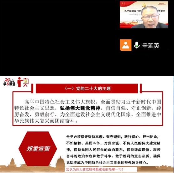 为深入学习贯彻党的二十大精神,切实把广大党员干部群众、青年学生的思想和行动统一到会议精神上来,2022年12月19日下午,我校邀请市委教育工委党的二十大精神“走基层”宣讲团成员、河北正定师范高等专科学校马克思主义学院党支部书记辛延英同志,通过腾讯会议,专场为我校师生做了党的二十大精神宣讲,报告会由校党委书记卢丽华主持,全校师生3000余人收看了宣讲会。